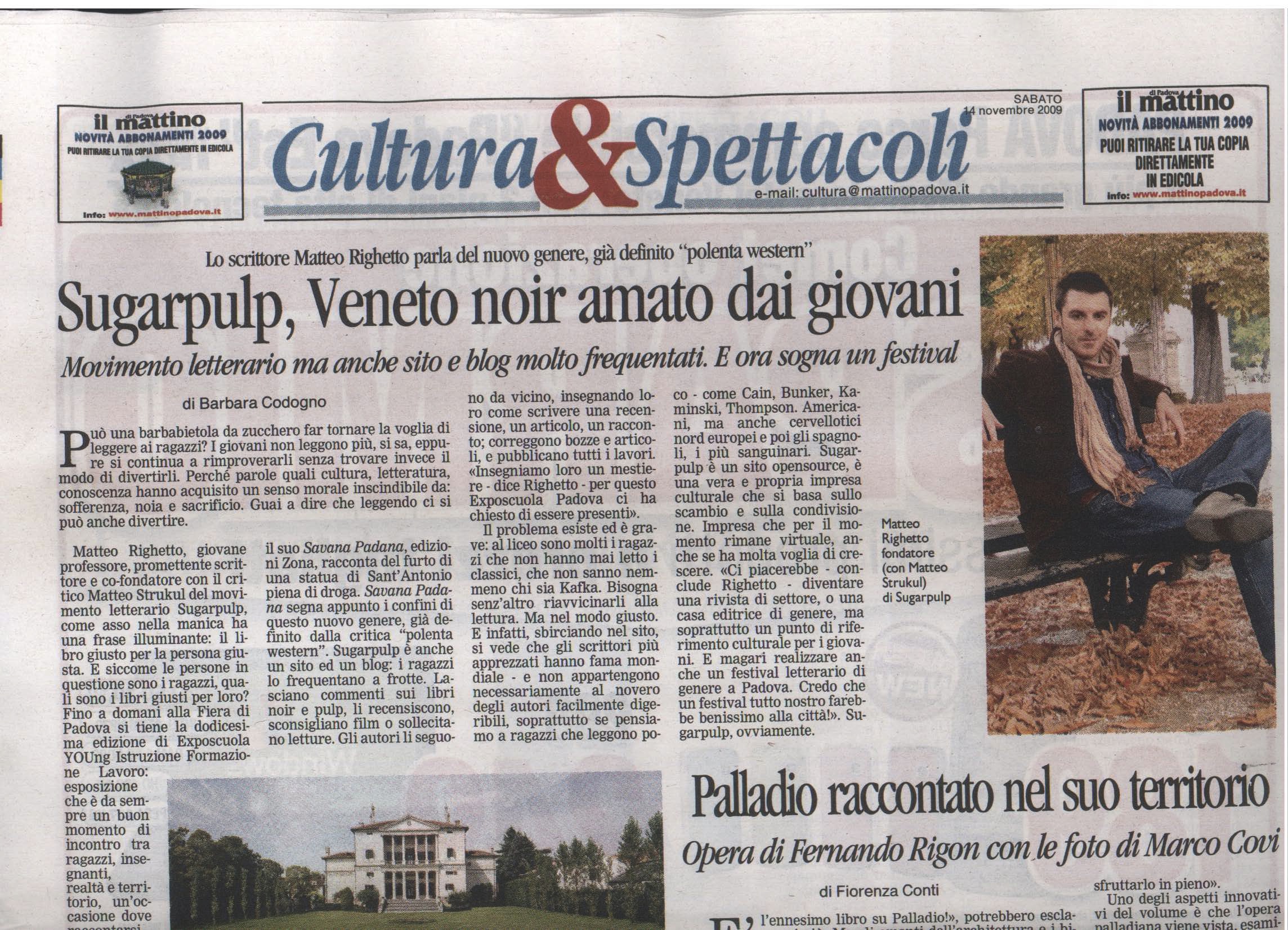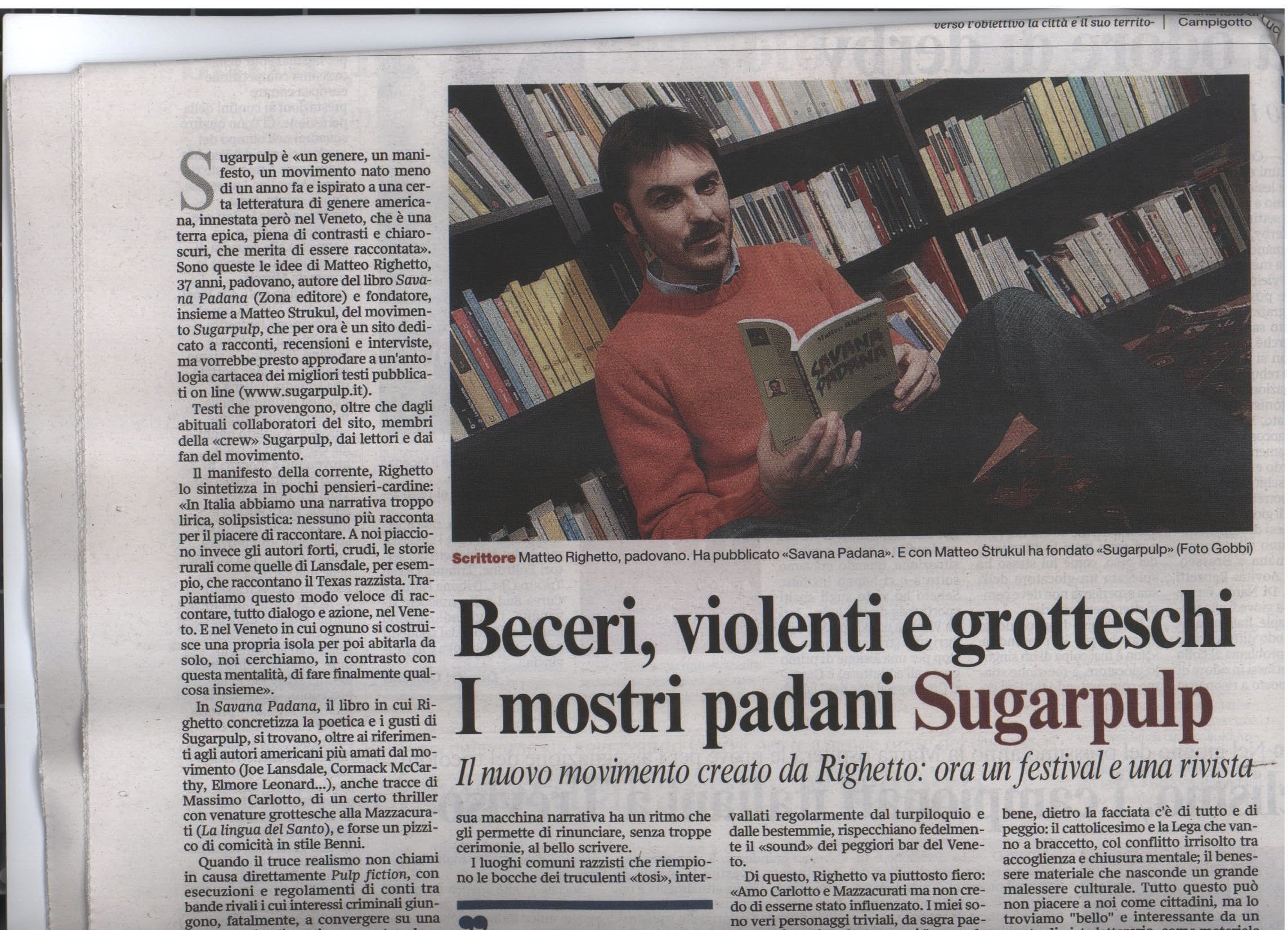 Sotto invece trovate un po’ di rassegna stampa di questi ultimi giorni: la recensione dell’audiolibro Sugarpulp pubblicata oggi sul Mattino di Padova, la Tribuna di Treviso e La Nuova di Venezia Mestre, e poi ancora le interviste a Matteo Righetto pubblicate sul Mattino di Padova e sul Corriere del Veneto di oggi (tutta la prima pagina della cultura!)