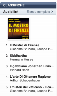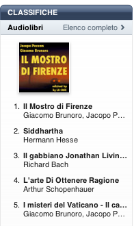 Tenendo conto che il libro è disponibile su iTunes da poco più di due settimane devo ammettere che si tratta di un successo che va oltre ogni più rosea previsione. Da quanto è uscito infatti l’audiolibro è costantemente nella top ten e oggi appunto ha raggiunto la vetta, scalzando Siddartha di Herman Hesse letto da Enzo De Caro che resisteva al top da un bel po’ di settimane.