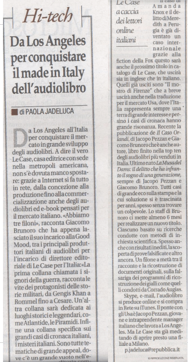 Il caso di Amanda Knox e il delitto di Meredith a Perugia è già diventato un caso internazionale grazie alla fiction della FOX, e questo sarà anche il prossimo titolo in catalogo di LA CASE, che commercializzerà l’audiolibro e l’ebook in due versioni: una in inglese per il mercato USA e una in Italiano. E’ già uscito invece “Il mostro di Firenze” che a breve verrà pubblicato anche nella traduzione per il mercato Usa, dove l’Italia rappresenta sempre una terra di grande interesse e persino i casi di cronaca hanno grande risonanza.