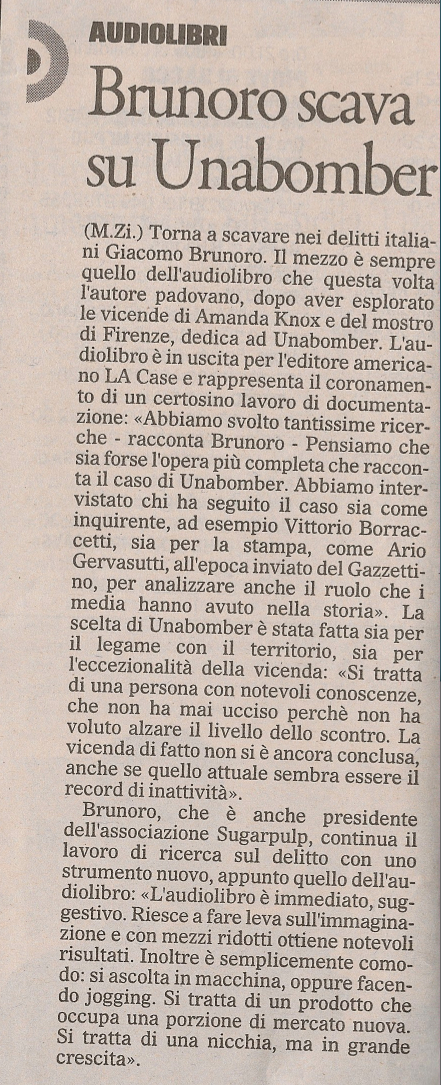 Nei giorni scorsi Massimo Zilio, giornalista del Gazzettino, mi ha intervistato per parlare in anteprima di “Unabomber: Terrore a Nord Est”, il nuovo audiolibro che sarà disponibile dalla settimana prossima su iTunes Store che ho scritto come sempre insieme a Jacopo Pezzan.