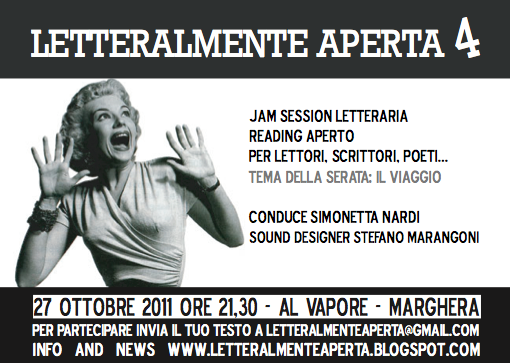 Se volete partecipare dovete inviare i testi entro e non oltre venerdì 21 ottobre a a letteralmenteaperta [at] gmail.com. Trovate tutte le info sul sito di Letteralmente Aperta.