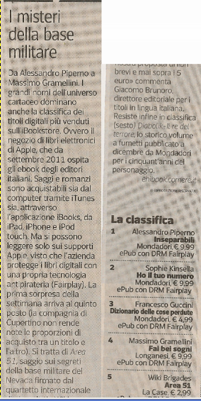 […] La prima sorpresa della settimana arriva al quinto posto (la compagnia di Cupertino non rende note le proporzioni di acquisto tra un titolo e l’altro). Si tratta di Area 51, saggio sui segreti della base militare del Nevada firmato dal quartetto internazionale di giornalisti «Wiki Brigades». A pubblicarlo l’editore digitale americano La Case.