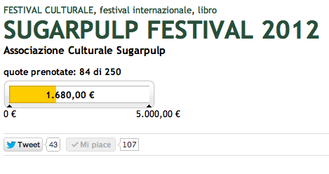 Il sistema è molto semplice: chiunque può donare 20 euro e finanziare il progetto Sugarpulp Festival 2012 attraverso Produzioni dal Basso, sito italiano specializzato in crowfounding. I soldi verranno effettivamente versati soltanto se si raggiungerà il numero di quote stabilito in partenza (al momento sono già state comprate 84 quote su 250 disponibili).